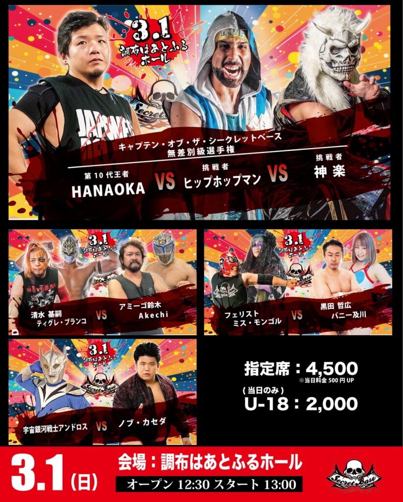 明日、3月1日に開催するプロレスリングSECRET BASE・調布はあとふるホール大会の当日券は12時30分より会場受付にて販売致します。