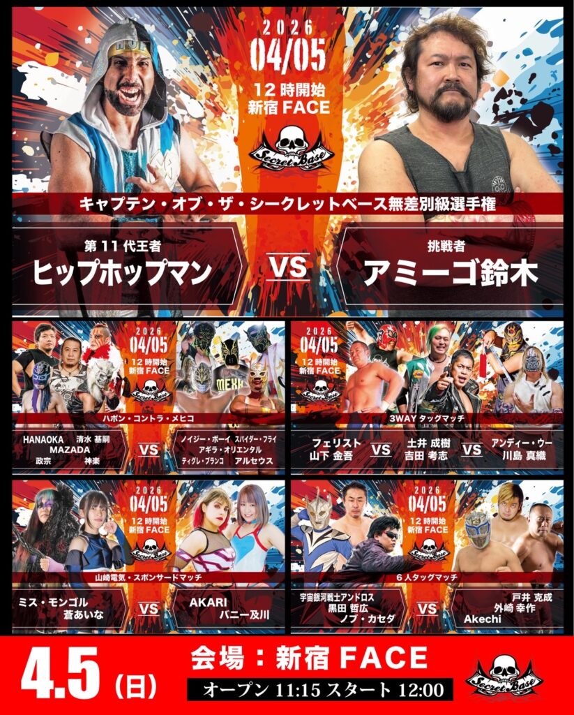 明日、4月5日に開催するプロレスリングSECRET BASE・新宿FACE大会の当日券は11:15より会場受付にて販売致します。