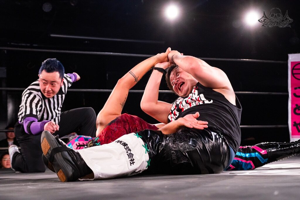 (14:33 俺のこの技で3カウントとれないはずがない→片エビ固め)